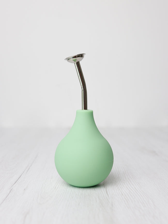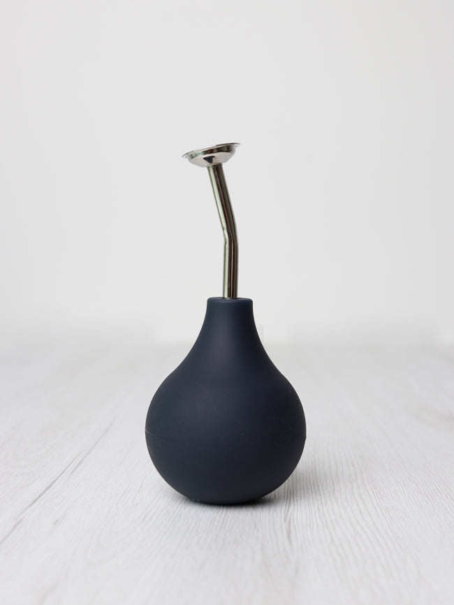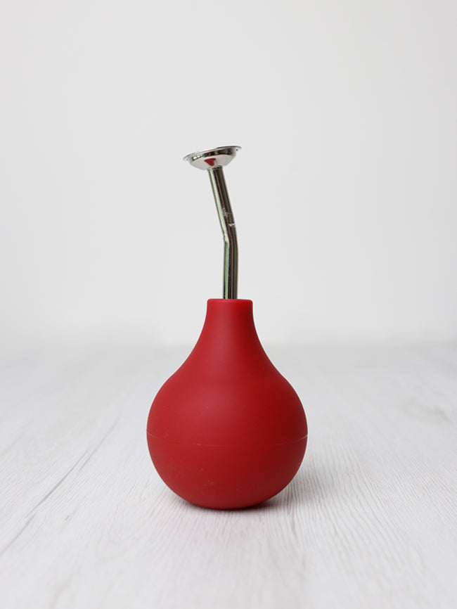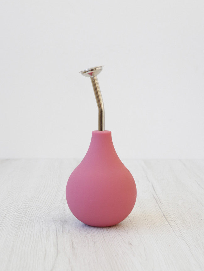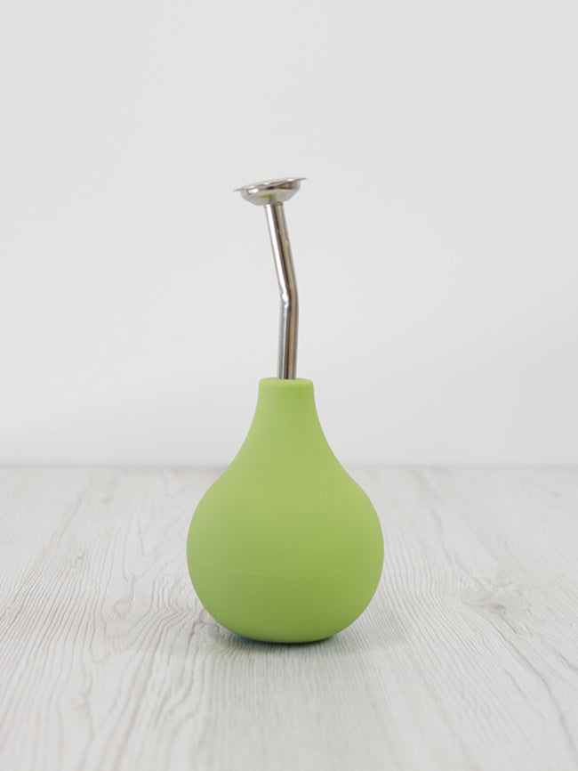 Den fungerar genom att man pressar på den mjuka gummibubblan för att få in och ut vatten. Metallstrilen kan ta tas bort också .